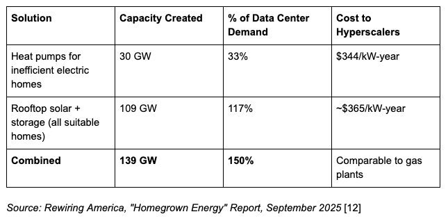 “Hyperscalers could meet one third of their projected additional capacity needs by paying for heat pumps in select households that currently use inefficient electric heating, cooling, and water heating, thereby creating capacity on the grid... Hyperscalers could more than meet their total planned capacity needs by paying for battery storage as well as rooftop solar for homes well suited for it.”