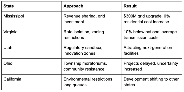 Federalism as laboratory: States can experiment with different data center benefit structures. Mississippi chose utility revenue sharing. Utah is exploring sandbox regulatory approaches. [27] Texas might try competitive energy markets with data center VPP mandates. Virginia is testing disclosure and zoning requirements.