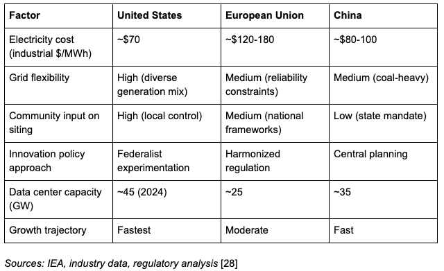 America’s electricity advantage persists even amid data center growth. The combination of cheaper power, regulatory flexibility, and community voice creates conditions for discovering optimal arrangements that neither pure market nor pure planning can achieve.