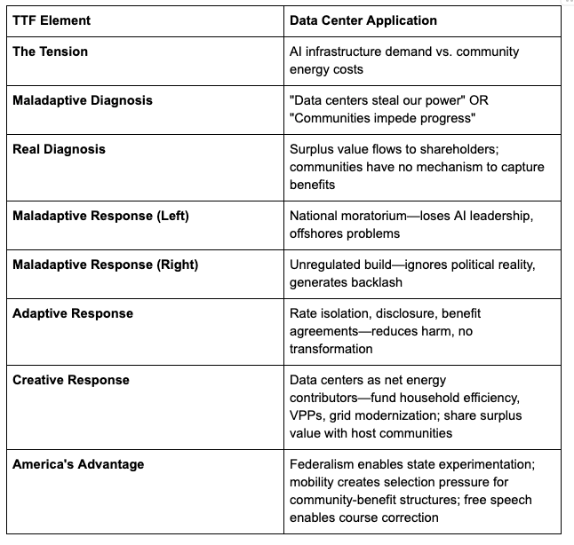 Mobility as selection pressure: Companies and capital can relocate. States that structure community-benefit deals attract investment. States that ban data centers lose both the problems and the opportunities to competitors. This isn’t a threat—it’s how federal systems discover optimal policies.