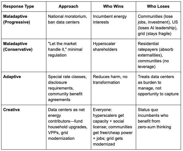 The moratorium movement has correctly identified that current arrangements are unfair. But “stop building” cedes the opportunity to capture benefits. Reframe the demand: not “no data centers” but “data centers that make our electricity cheaper—or free.” The math supports aggressive asks.